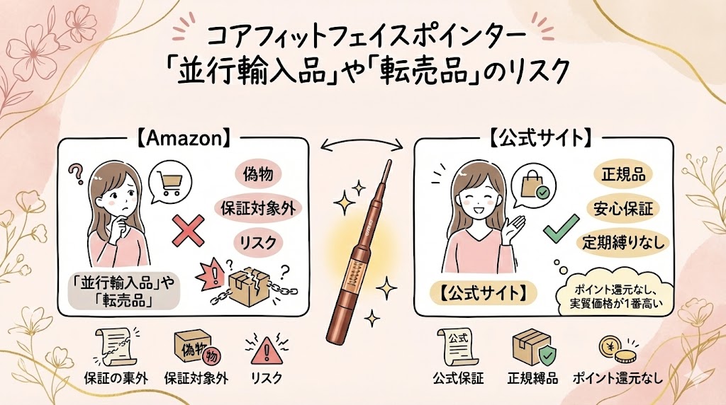 コアフィットフェイスポインターはとても人気が高いため、本物によく似た偽物や、見た目だけを真似た品質の低い類似品が出回っています。