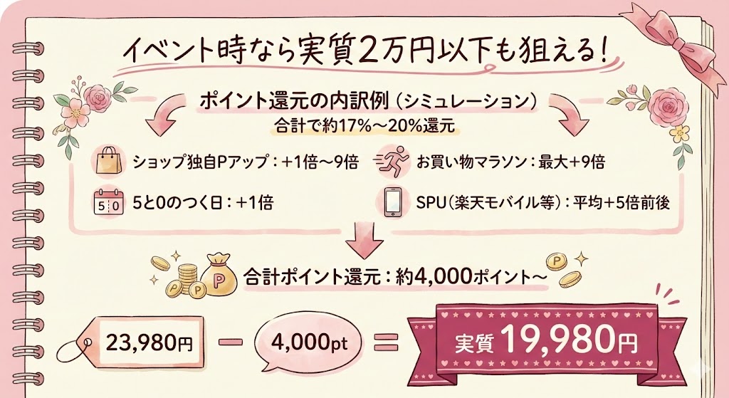 ショップ買いまわりなどのポイントアップを組み合わせることで、実質2,000円〜4,000円引き相当で買うことも夢ではありません。