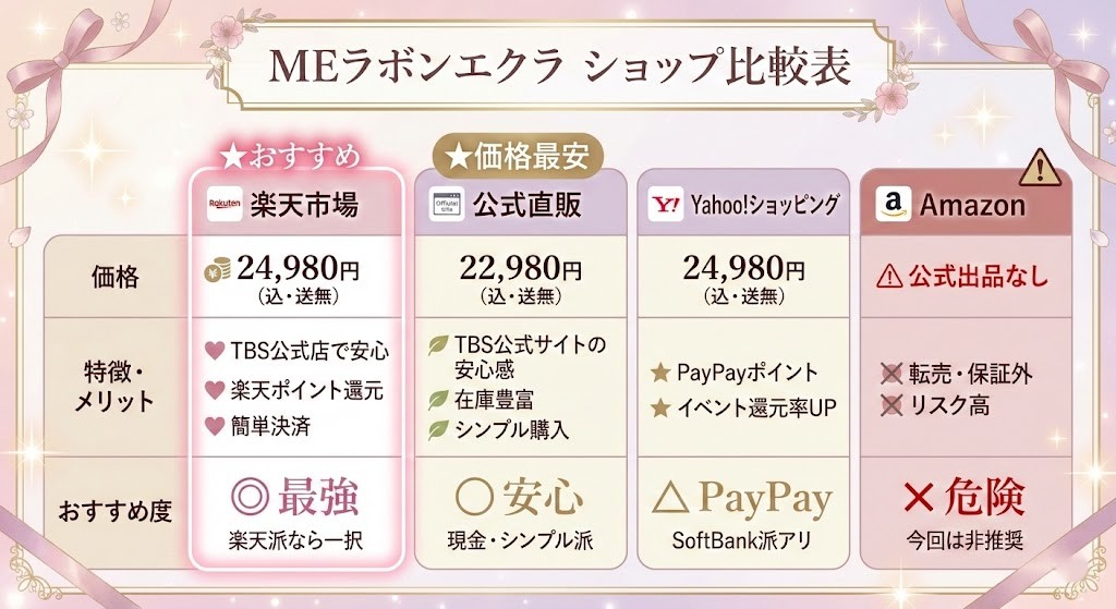MEラボンエクラを最安値で安心して買えるのは、以下の2つの「TBS公式ショップ」です。
