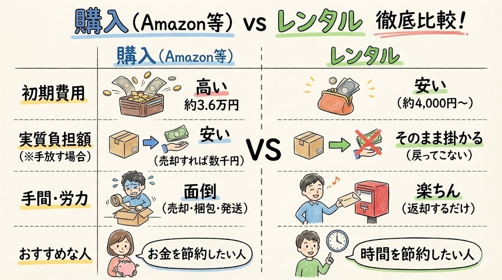 • 数百円の損より、面倒な作業がないほうがいい➡ レンタル がおすすめ